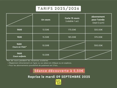 320€ l'année (septembre 2025 à juin 2026) - 1 cours par semaine