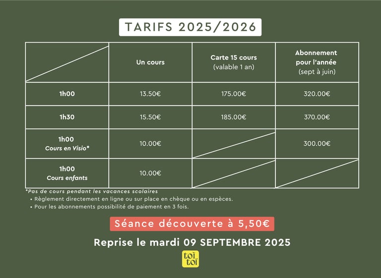 Espace Toï Toï = 13,50€/cours - 170€ la carte de 15 cours - 320€ l'année